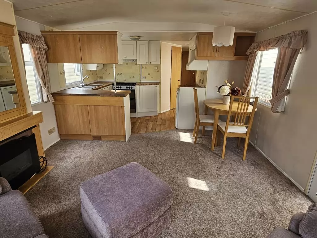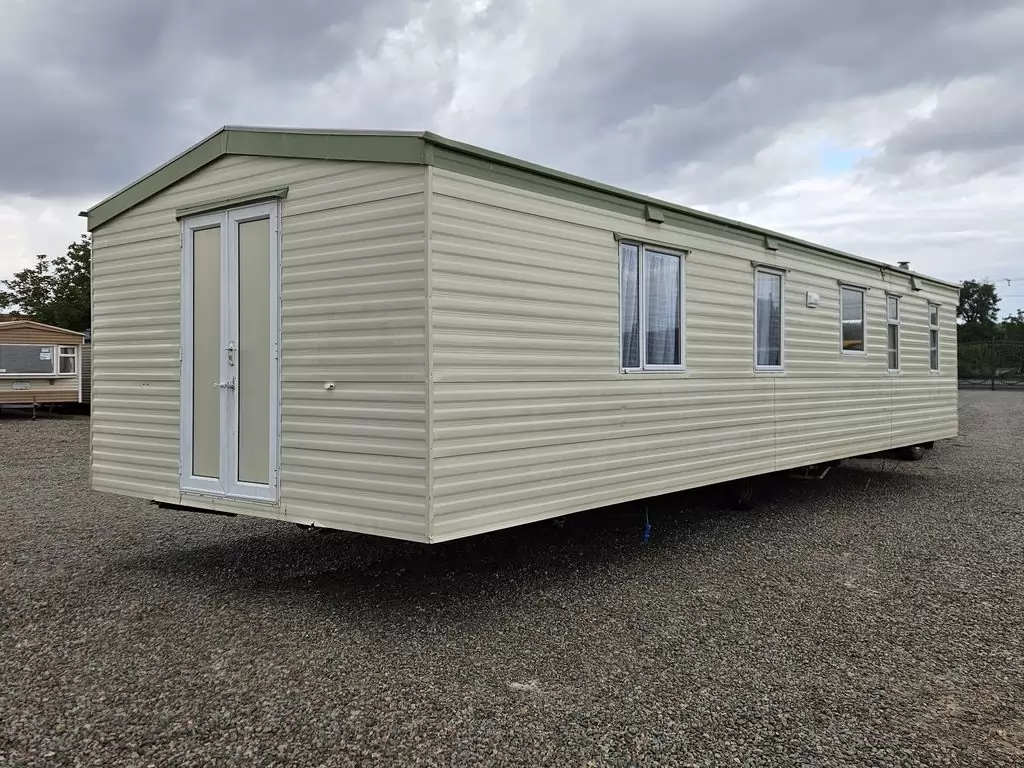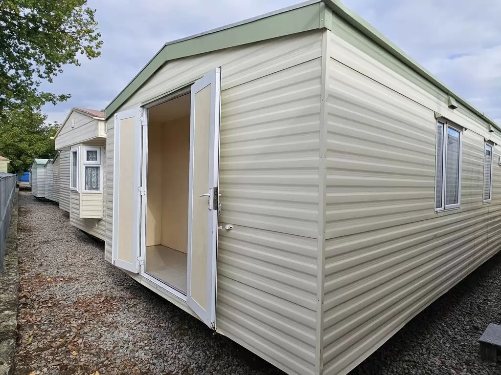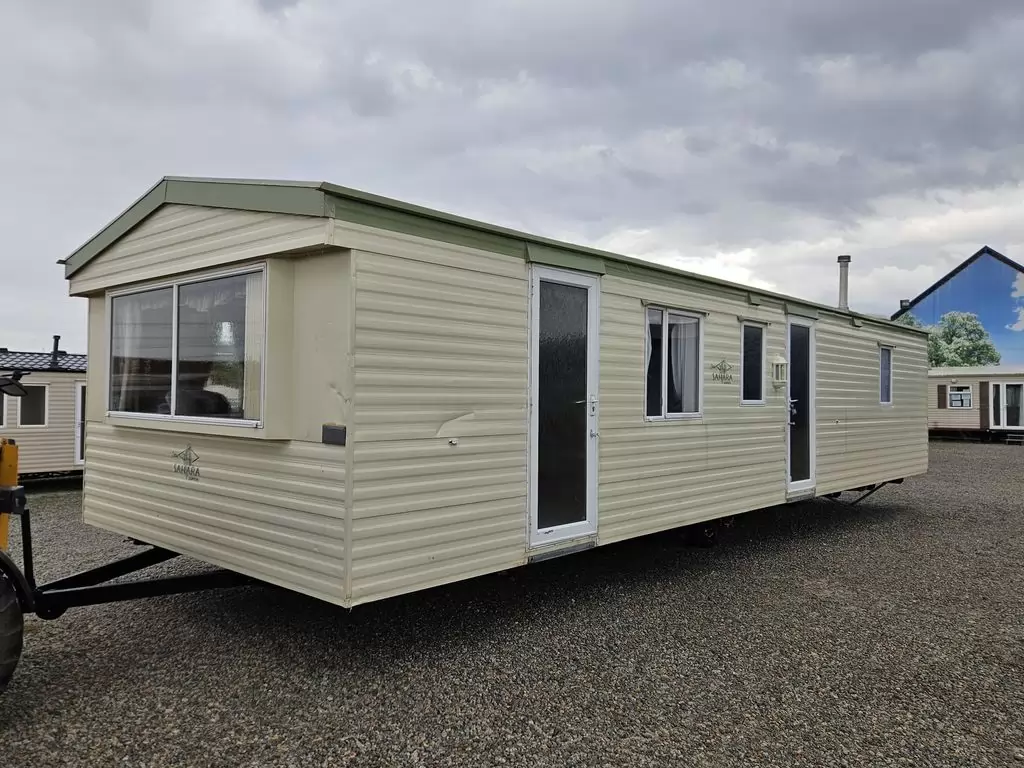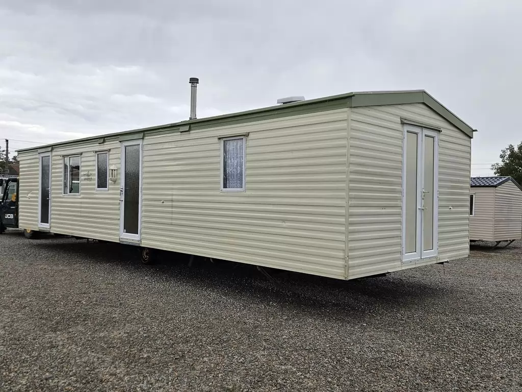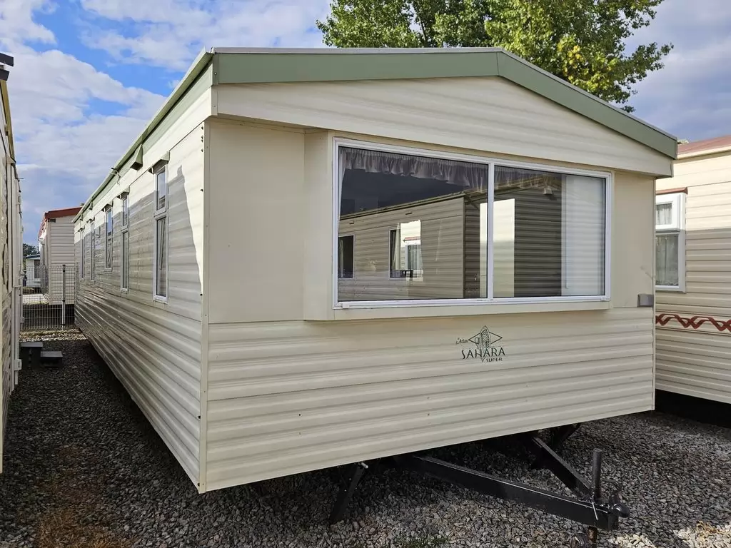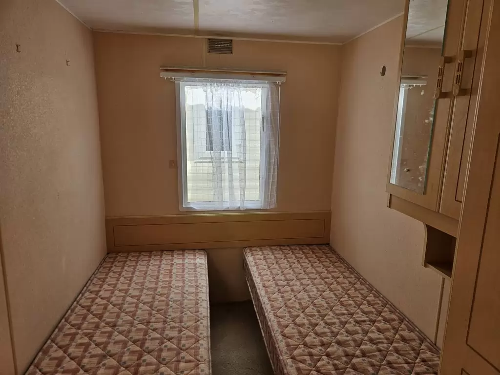Extra breites, SCHÖNES, voll ausgestattetes Mobilheim 10,9 x 3,7 m mit zwei Eingängen, Satteldach, doppelten (isolierten) Fenstern und Türen – Dithermie. Geräumiges Wohnzimmer, Essbereich, schöne U-förmige Küche inklusive Geräten, Schlafzimmer (Doppelbett), Zimmer (2 Betten), Badezimmer mit Dusche, WC. Elektrischer Kamin, Gas-Wasser-Heizung. Stauraum außerhalb der Rückseite des Mobilheims. Erhöhte Decke im gesamten Mobilheim!