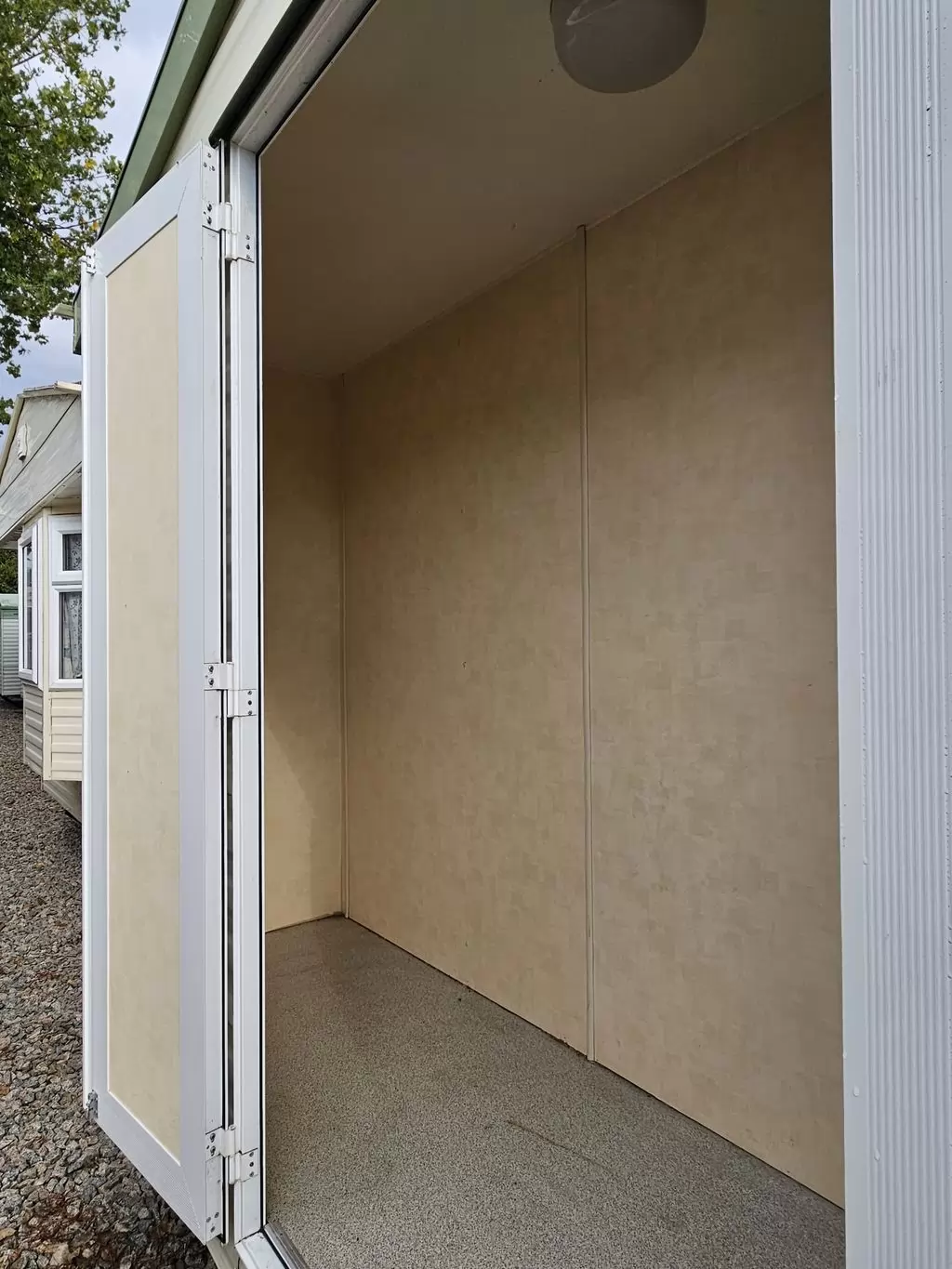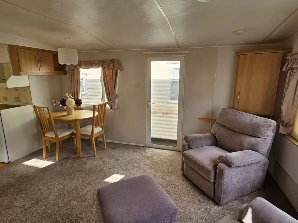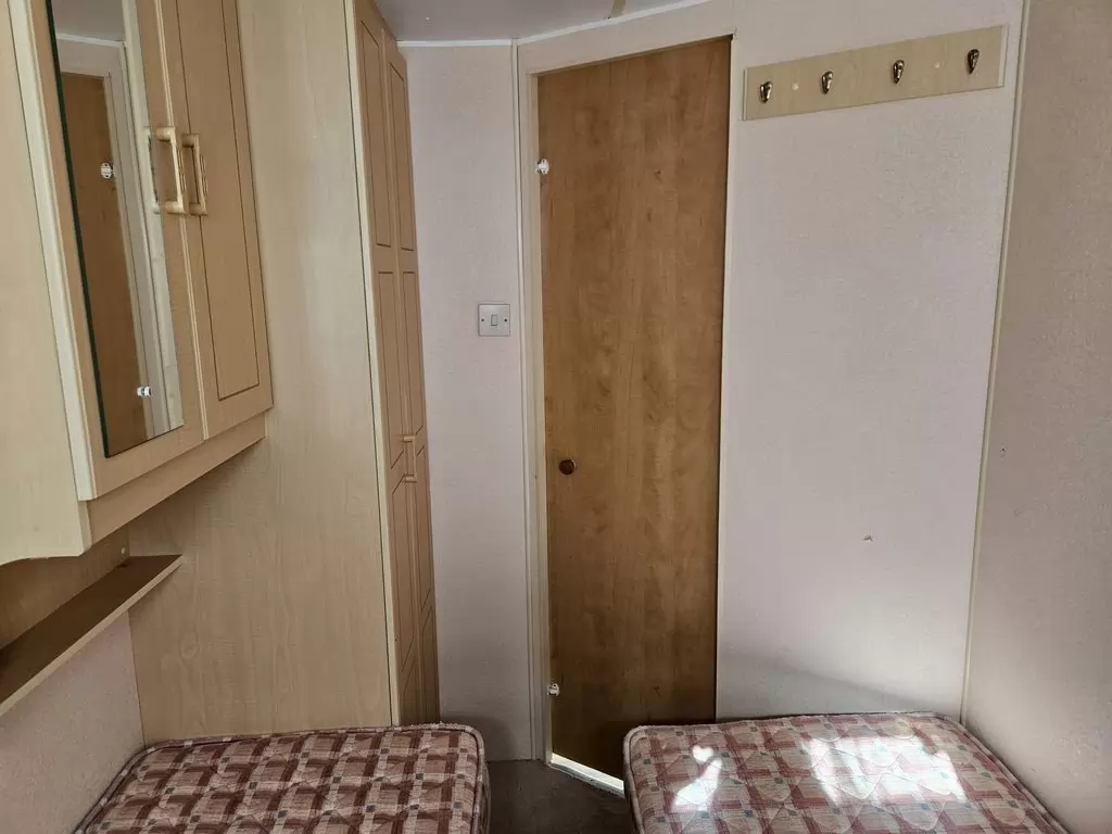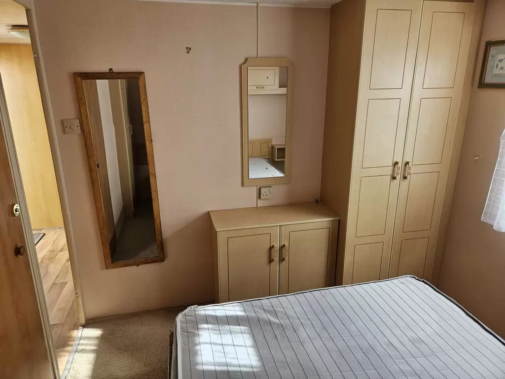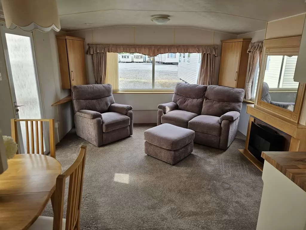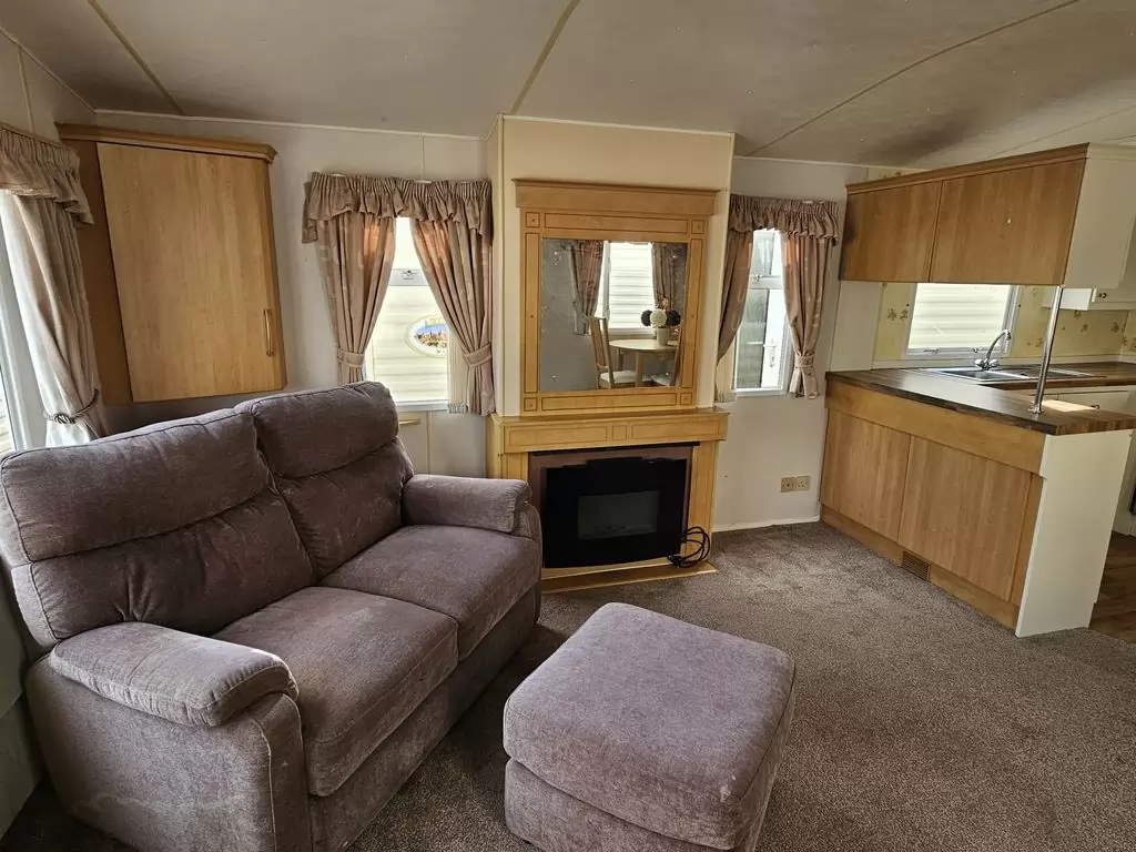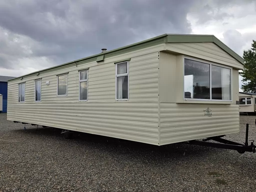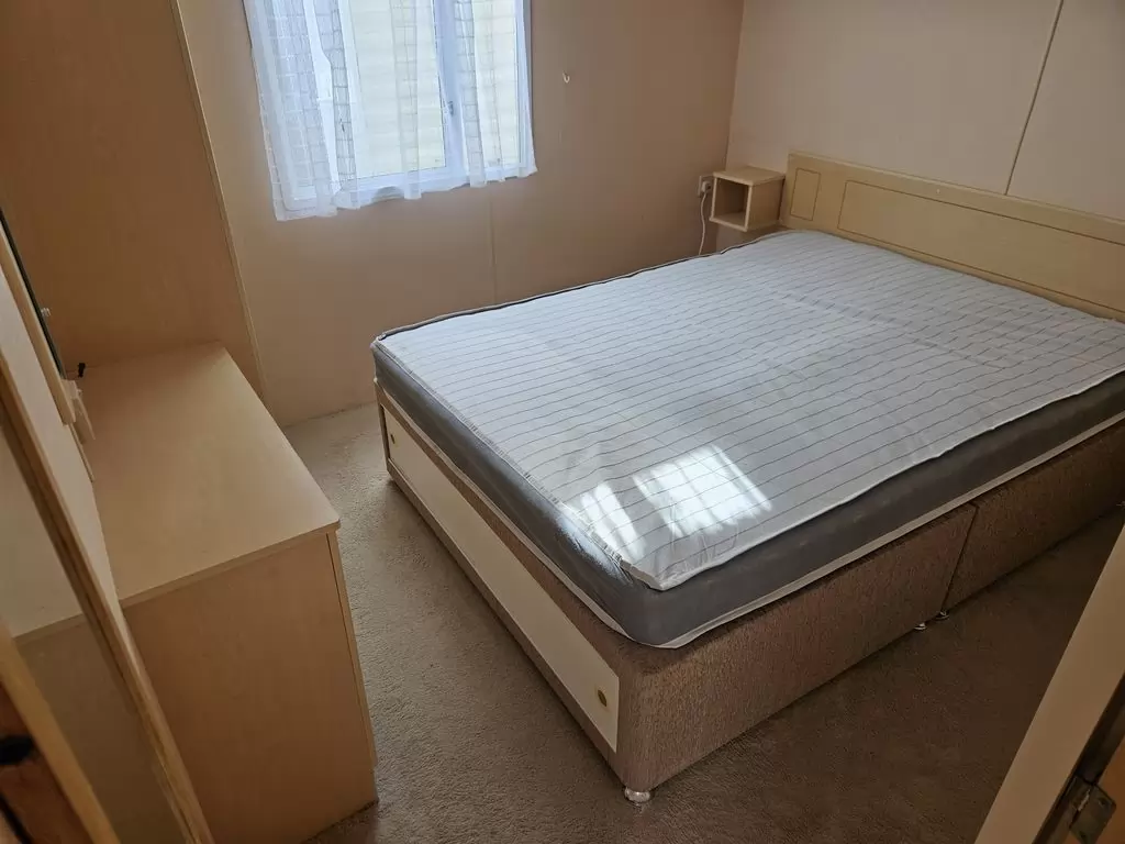 Extra breites, SCHÖNES, voll ausgestattetes Mobilheim 10,9 x 3,7 m mit zwei Eingängen, Satteldach, doppelten (isolierten) Fenstern und Türen – Dithermie. Geräumiges Wohnzimmer, Essbereich, schöne U-förmige Küche inklusive Geräten, Schlafzimmer (Doppelbett), Zimmer (2 Betten), Badezimmer mit Dusche, WC. Elektrischer Kamin, Gas-Wasser-Heizung. Stauraum außerhalb der Rückseite des Mobilheims. Erhöhte Decke im gesamten Mobilheim!