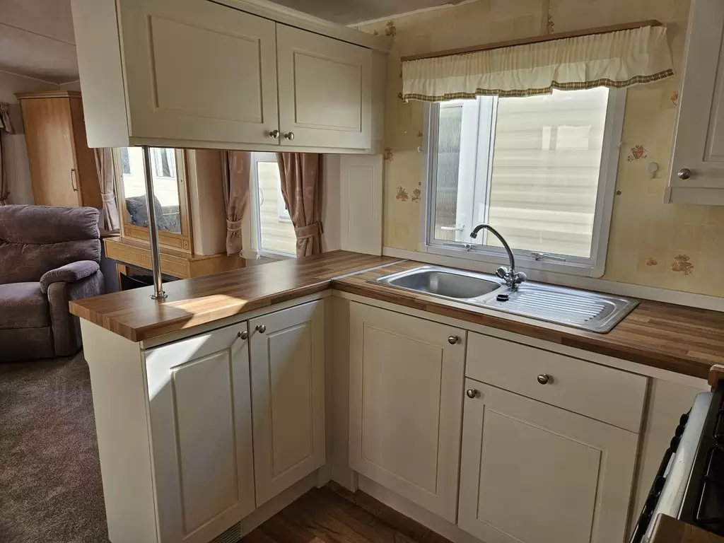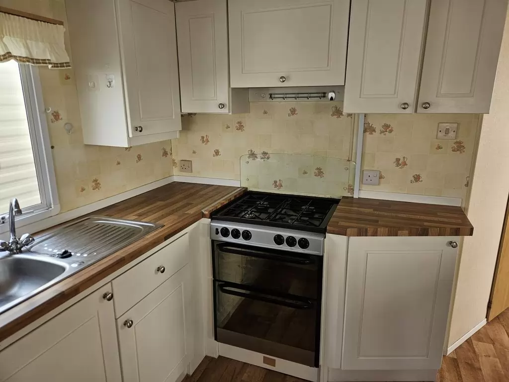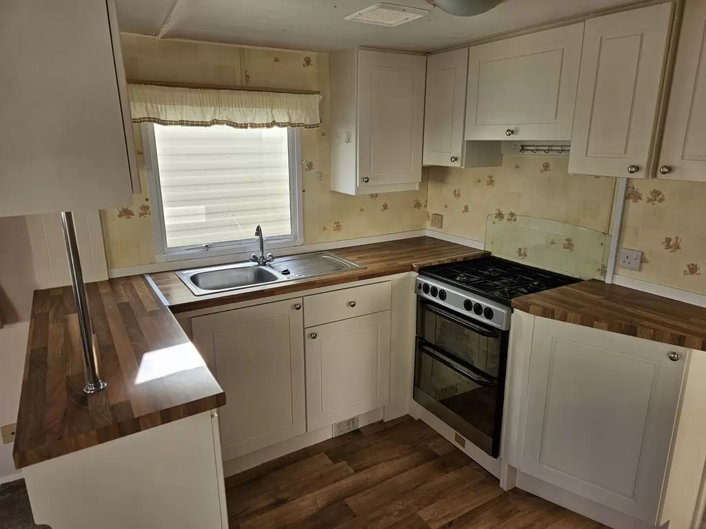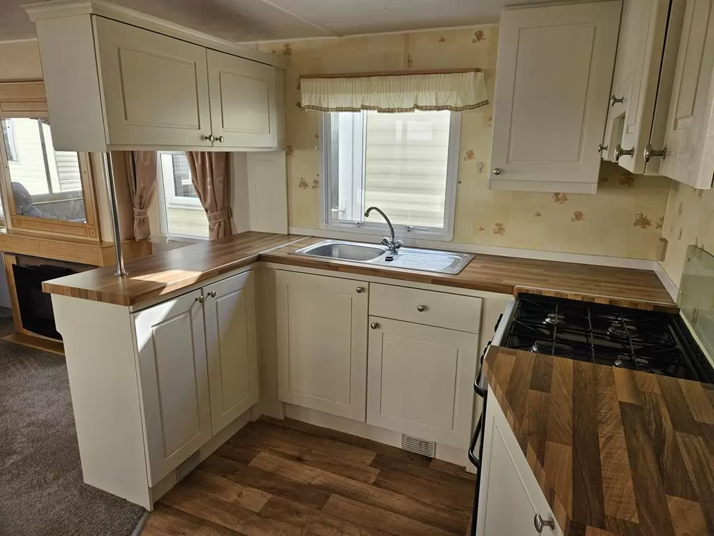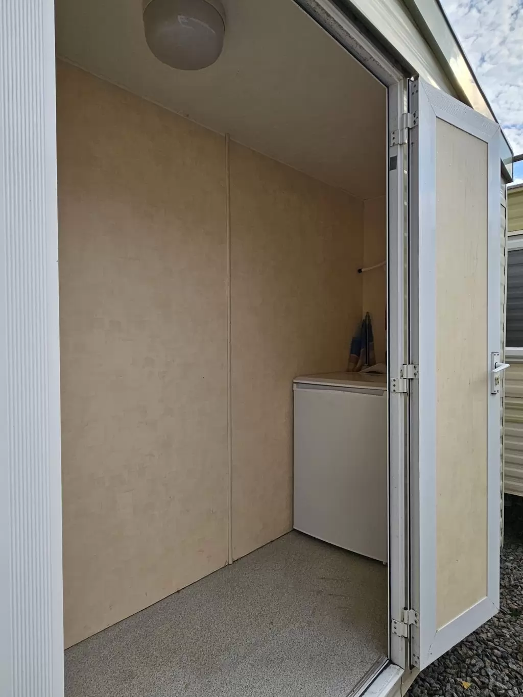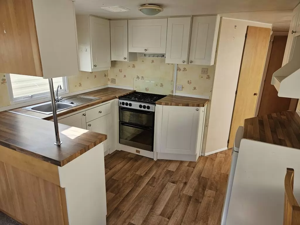Extra breites, SCHÖNES, voll ausgestattetes Mobilheim 10,9 x 3,7 m mit zwei Eingängen, Satteldach, doppelten (isolierten) Fenstern und Türen – Dithermie. Geräumiges Wohnzimmer, Essbereich, schöne U-förmige Küche inklusive Geräten, Schlafzimmer (Doppelbett), Zimmer (2 Betten), Badezimmer mit Dusche, WC. Elektrischer Kamin, Gas-Wasser-Heizung. Stauraum außerhalb der Rückseite des Mobilheims. Erhöhte Decke im gesamten Mobilheim!