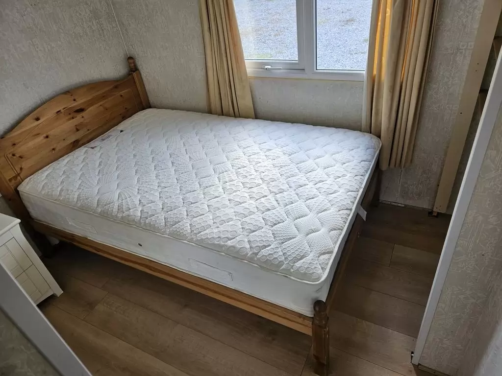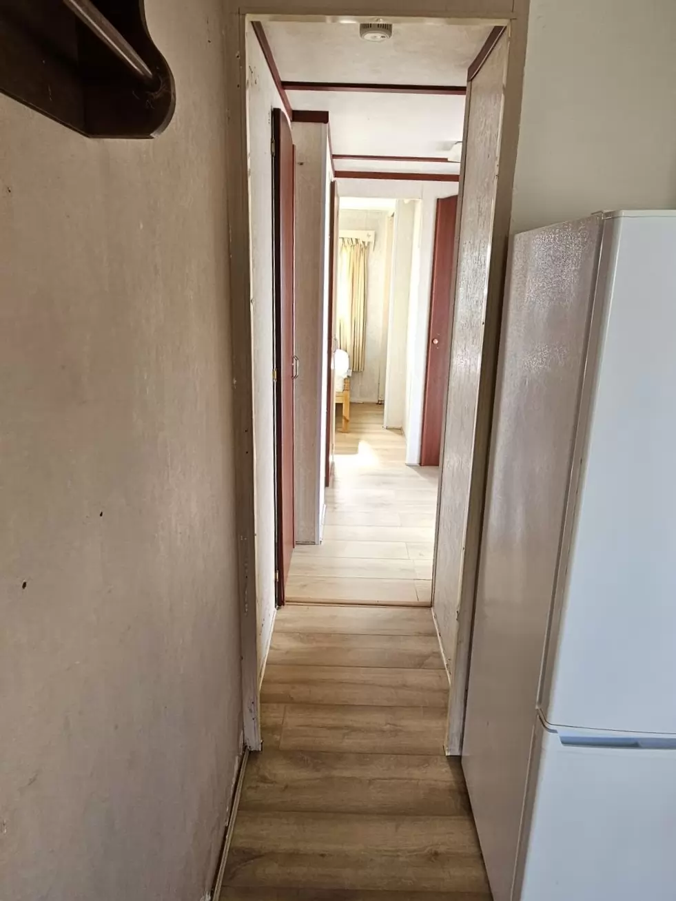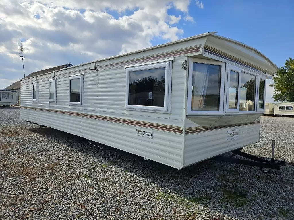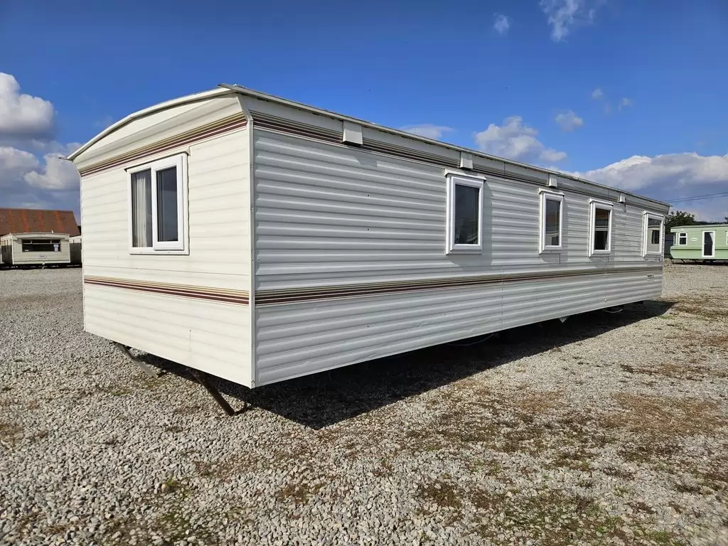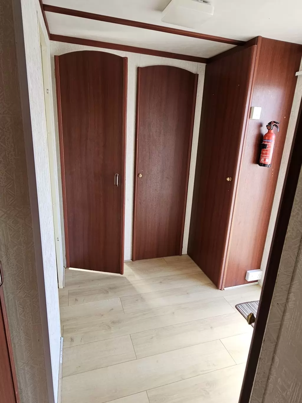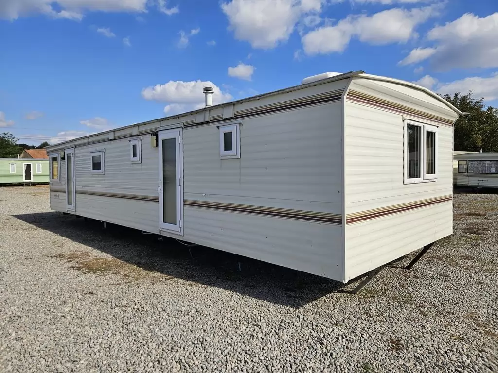 Extra breites, unmöbliertes Mobilheim 11,3 x 3,7 m mit zwei Eingängen, DOPPELTE (isolierte) FENSTER UND TÜREN – Dithermie. Wohnzimmer, Essbereich, U-förmige Küche inkl. Geräte, Schlafzimmer (Doppelbett), Zimmer (Bett), Zimmer, Badezimmer mit Dusche, Toilette mit Waschbecken. Gas-Wasserheizung.
