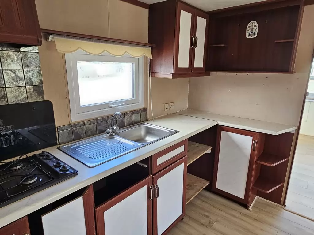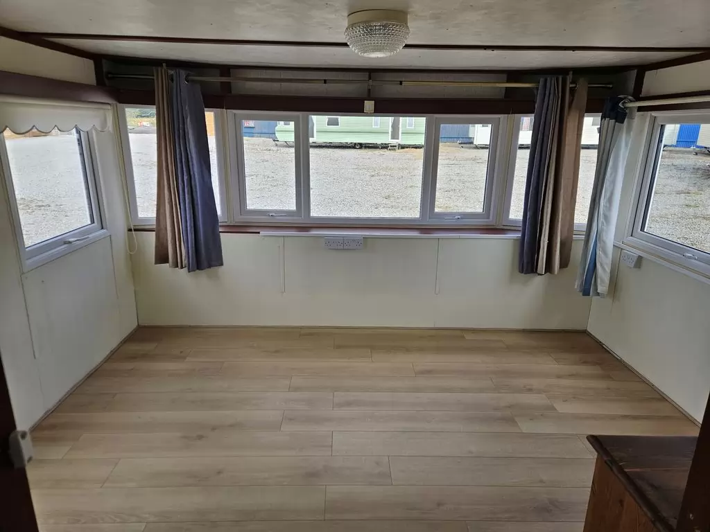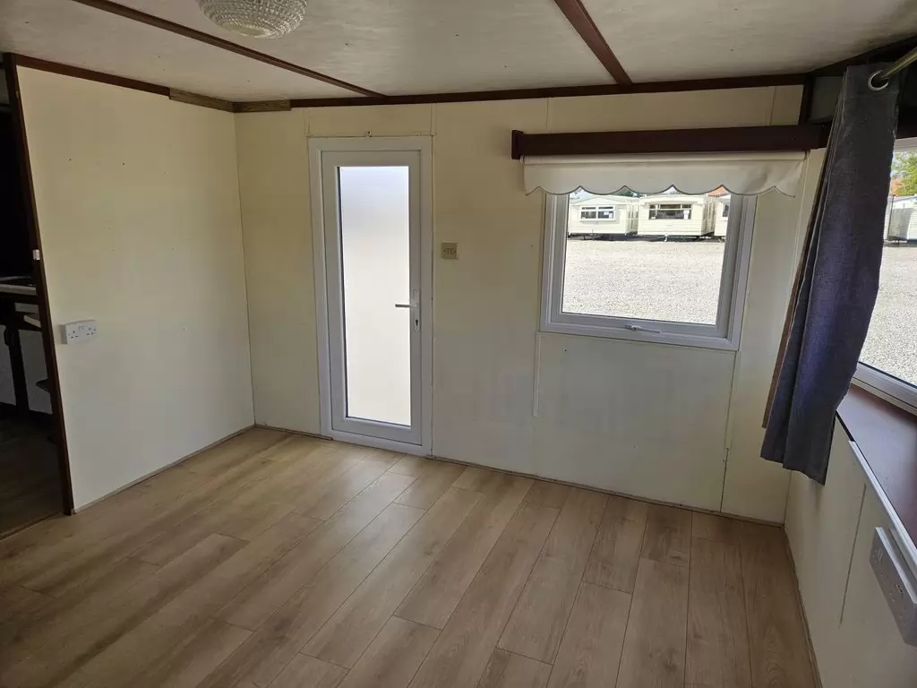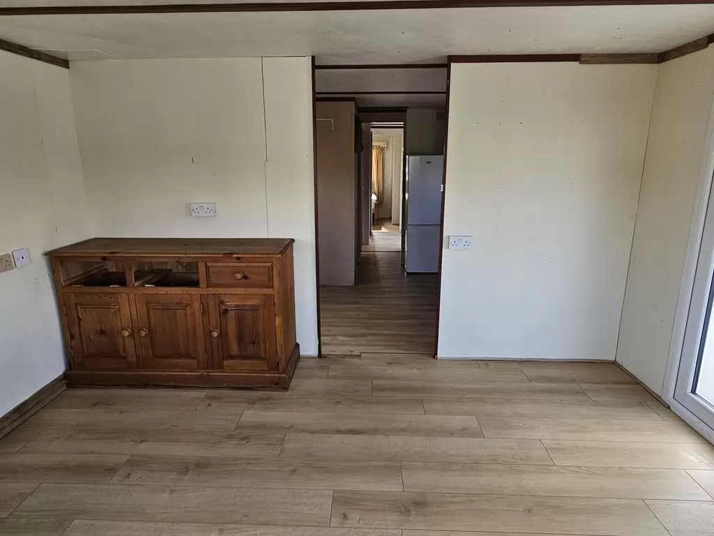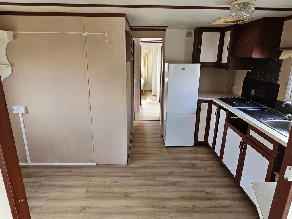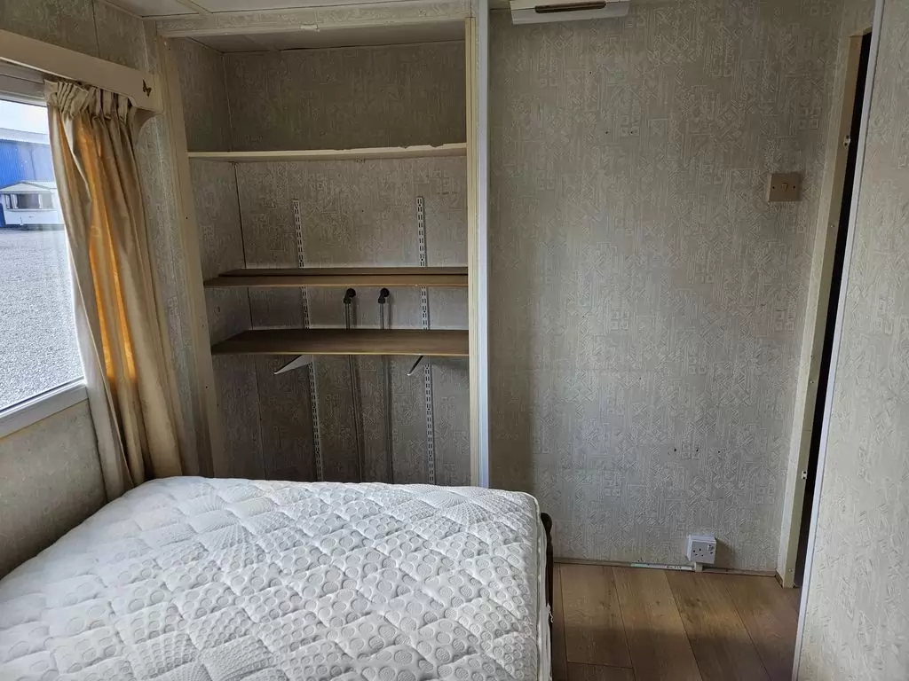 Extra breites, unmöbliertes Mobilheim 11,3 x 3,7 m mit zwei Eingängen, DOPPELTE (isolierte) FENSTER UND TÜREN – Dithermie. Wohnzimmer, Essbereich, U-förmige Küche inkl. Geräte, Schlafzimmer (Doppelbett), Zimmer (Bett), Zimmer, Badezimmer mit Dusche, Toilette mit Waschbecken. Gas-Wasserheizung.