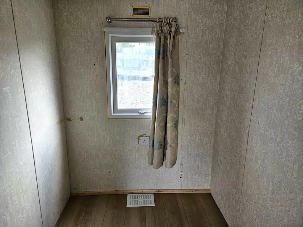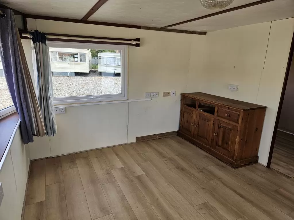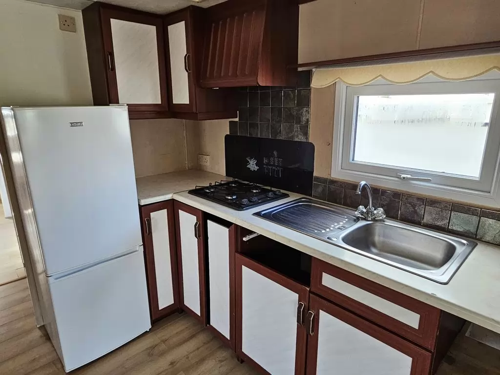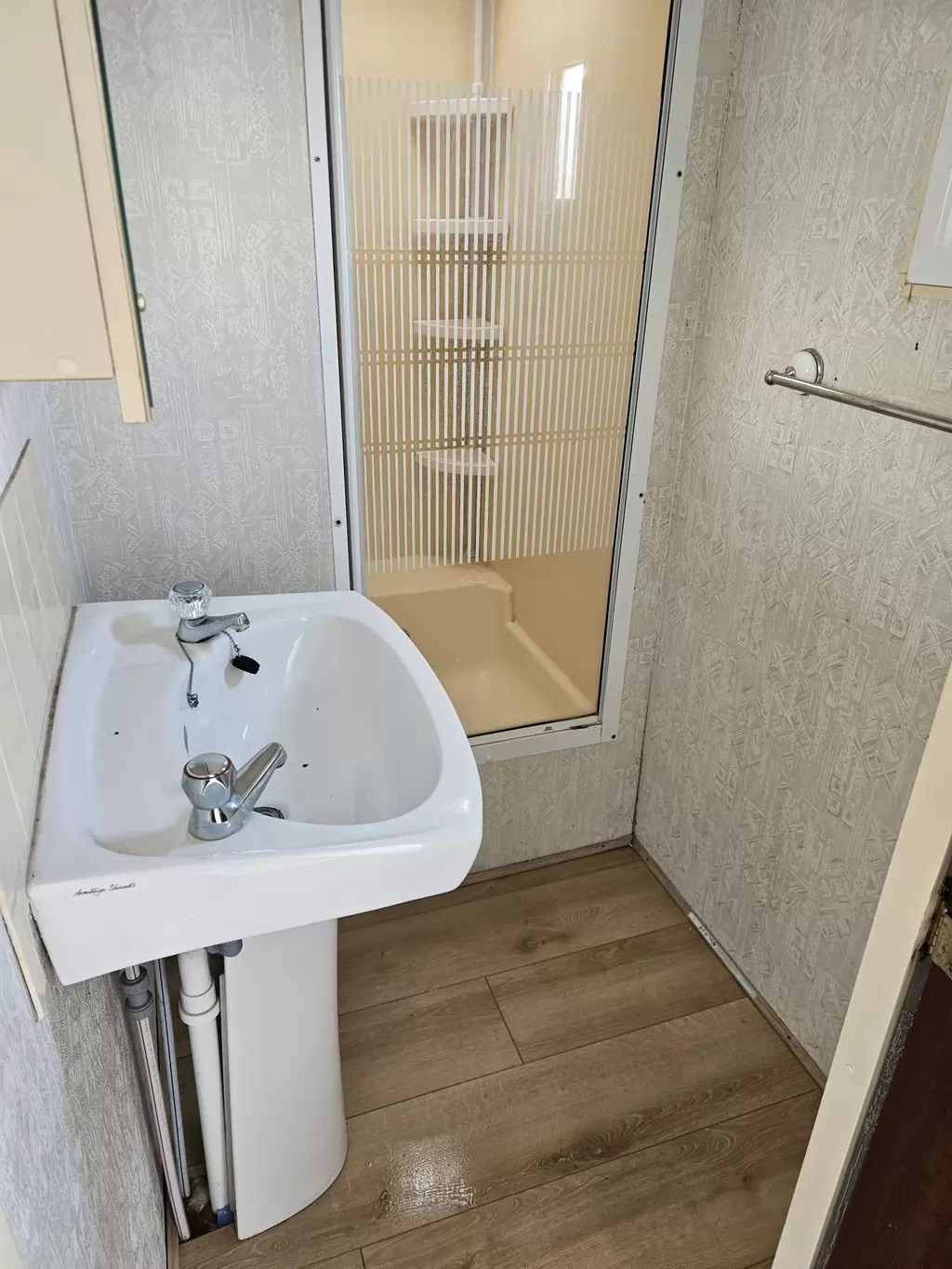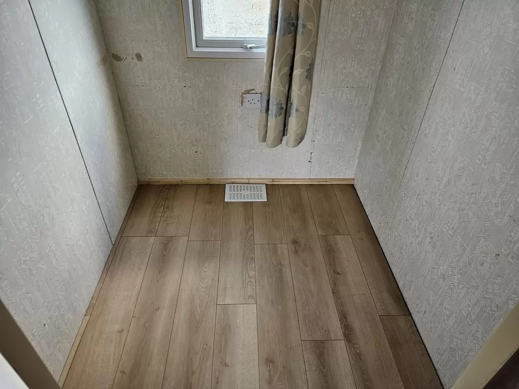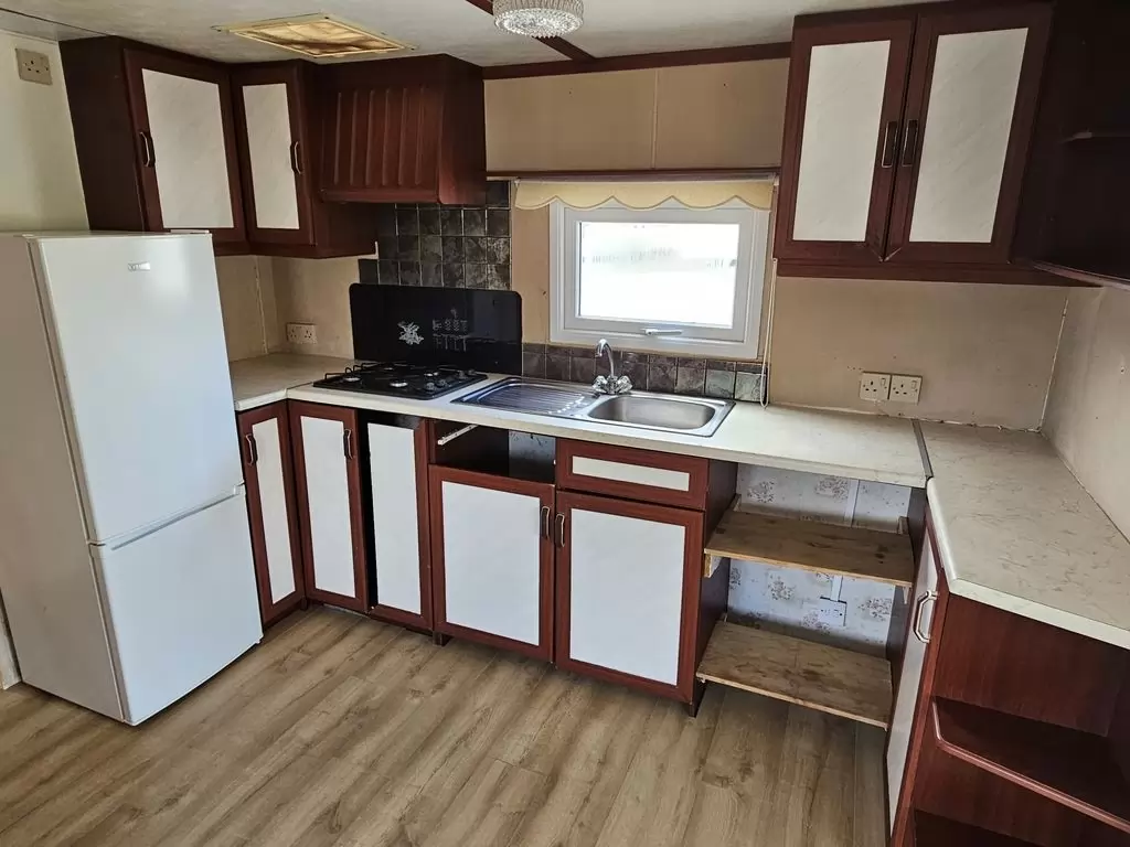 Extra breites, unmöbliertes Mobilheim 11,3 x 3,7 m mit zwei Eingängen, DOPPELTE (isolierte) FENSTER UND TÜREN – Dithermie. Wohnzimmer, Essbereich, U-förmige Küche inkl. Geräte, Schlafzimmer (Doppelbett), Zimmer (Bett), Zimmer, Badezimmer mit Dusche, Toilette mit Waschbecken. Gas-Wasserheizung.