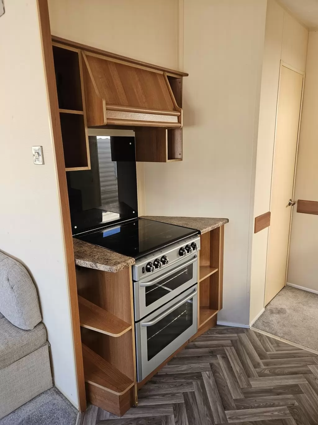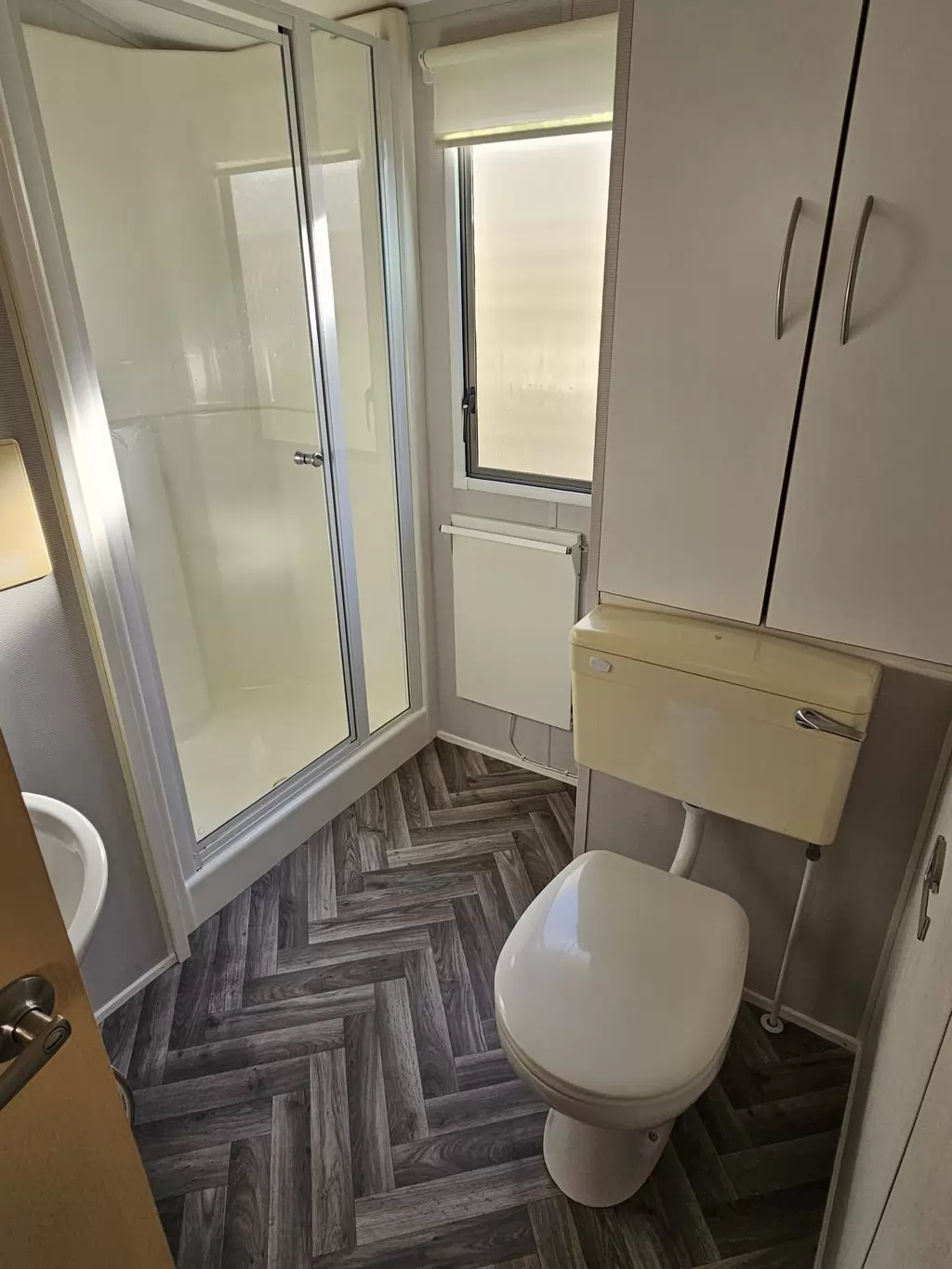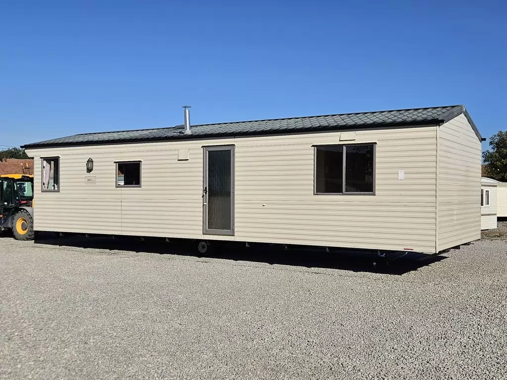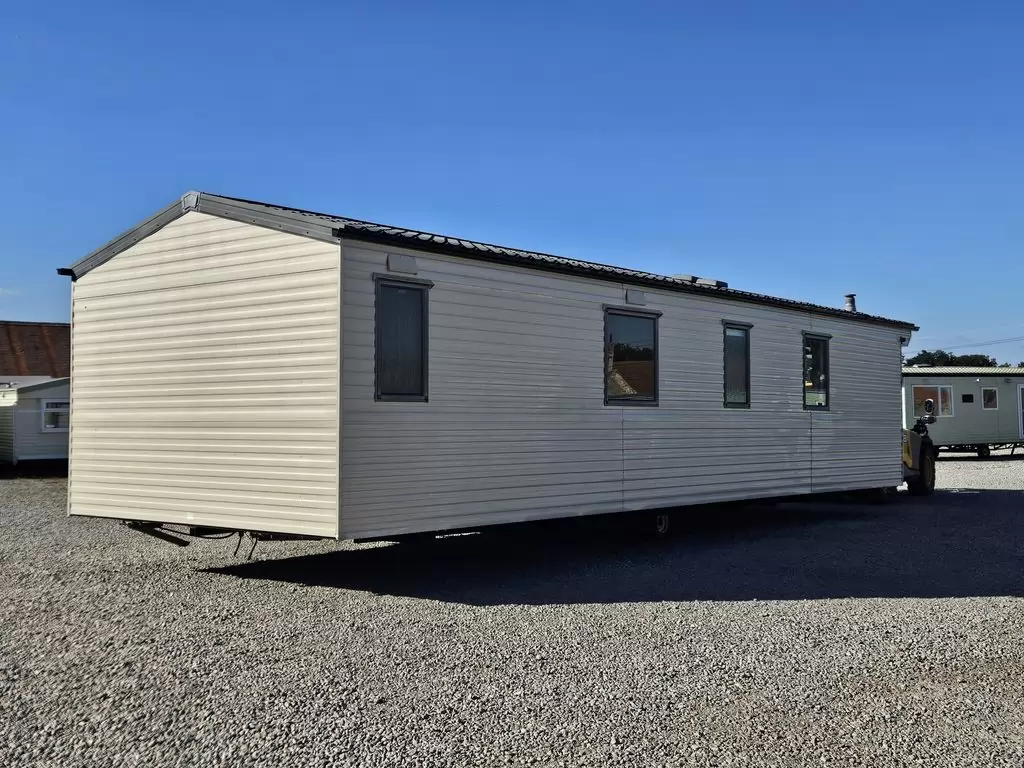 Extra breites, SCHÖNES, geräumiges, voll ausgestattetes Mobilheim 11 x 3,7 m mit einem Eingang, Satteldach mit Dachziegelimitation, doppelten (isolierten) Fenstern und Türen – Dithermie. Geräumiges Wohnzimmer (Schlafsofa), Küche, geräumiges Schlafzimmer (Doppelbett) + Toilette mit Waschbecken, geräumiges Zimmer (Bett), Badezimmer mit Dusche + Toilette. Gaskamin + Elektroheizung in den Zimmern, Gas-Wasserheizung. Erhöhte Decke im gesamten Mobilheim!!