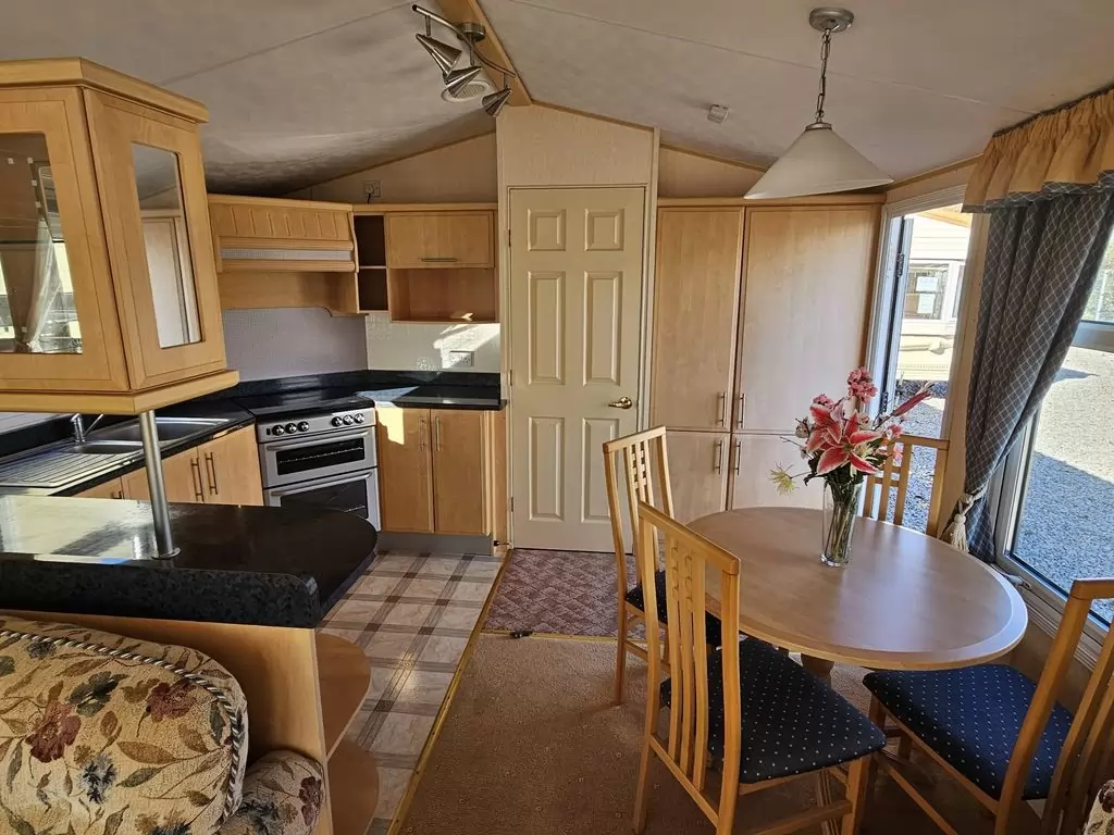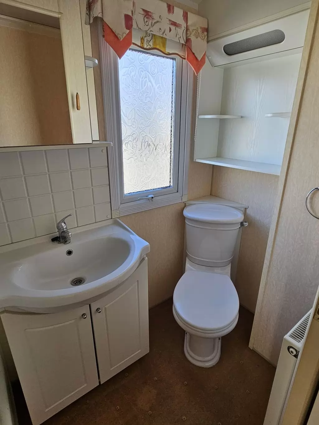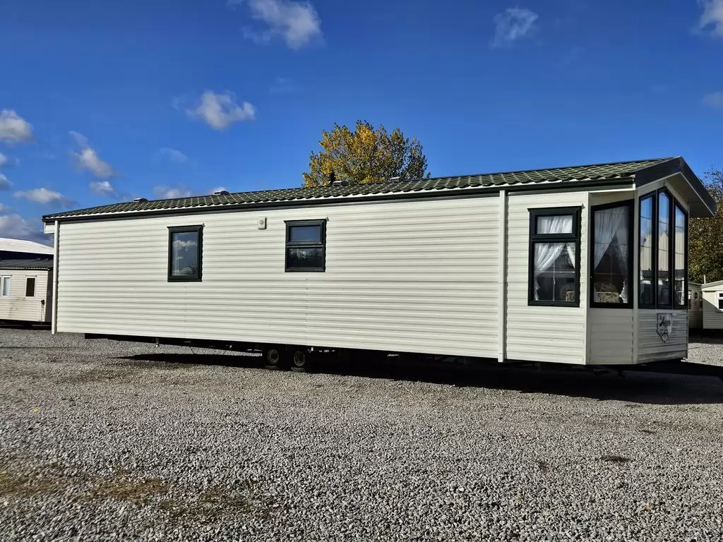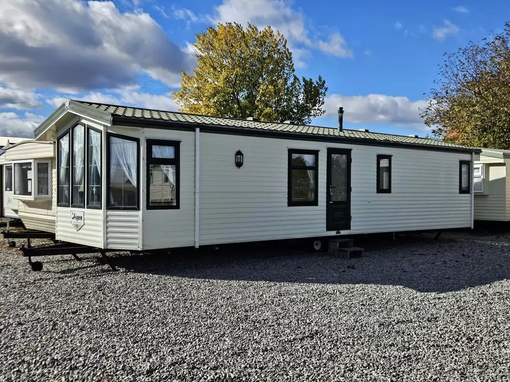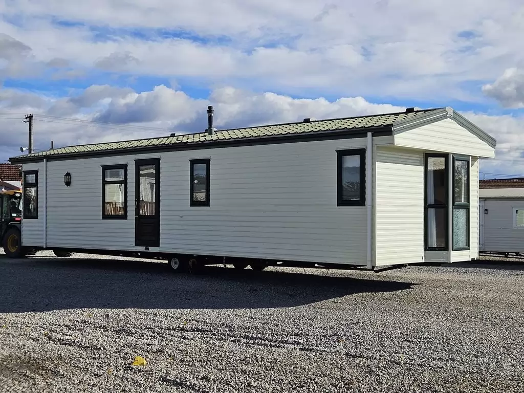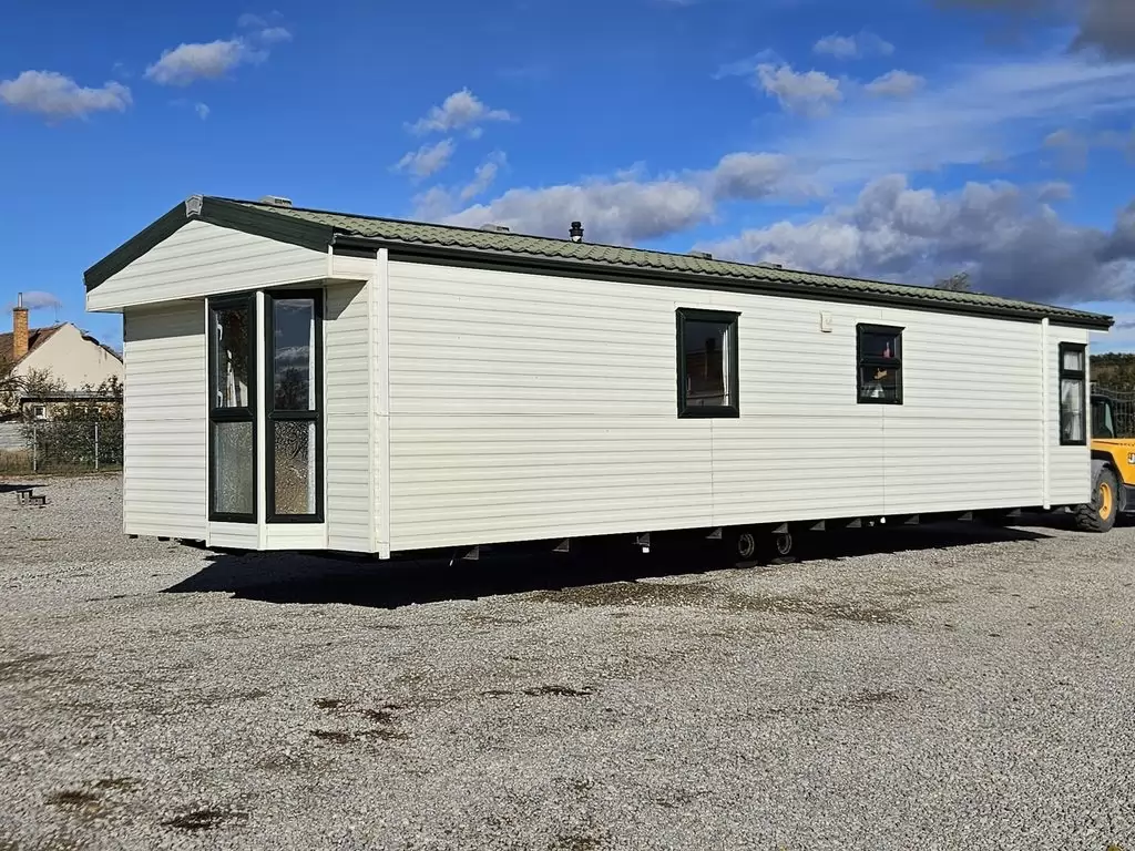Extra breites, schönes, sauberes, voll ausgestattetes Mobilheim 11,8 x 3,7 m mit einem Eingang, HAMMERDACH, DOPPELTE (isolierte) FENSTER UND TÜREN – Dithermie, ZENTRALHEIZUNG – Gaskessel + Heizkörper in allen Zimmern + elektrischer Kamin im Wohnzimmer. Wohnzimmer (Schlafsofa), Essbereich, U-förmige Küche inkl. Geräte, Schlafzimmer (Doppelbett) + Toilette mit Waschbecken, Zimmer (2 Betten), Badezimmer mit Dusche + Toilette. Erhöhte Decke im gesamten Mobilheim!!