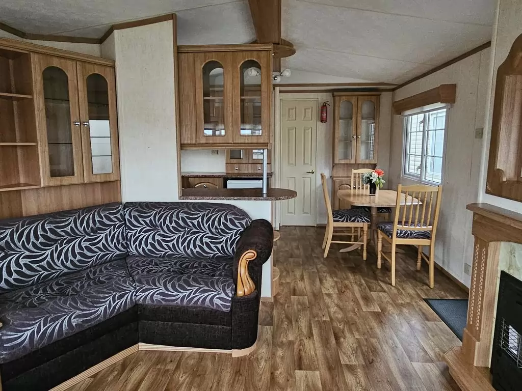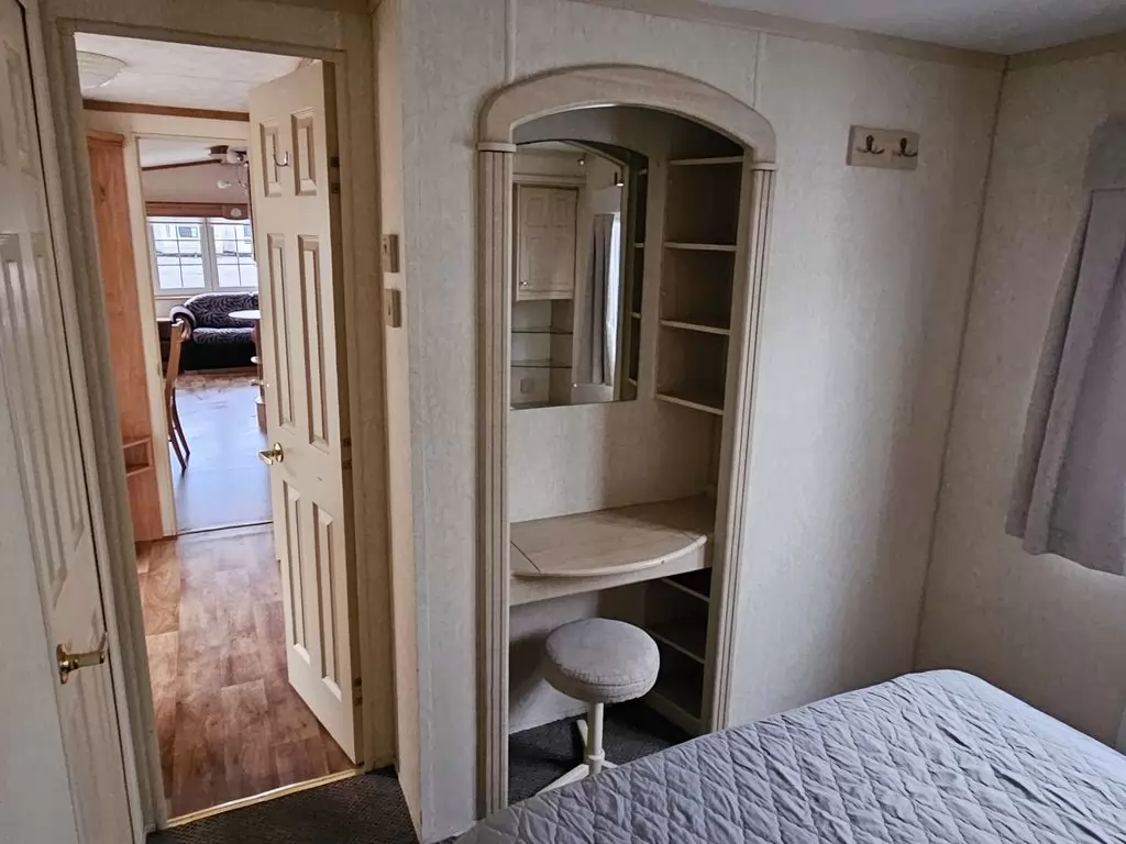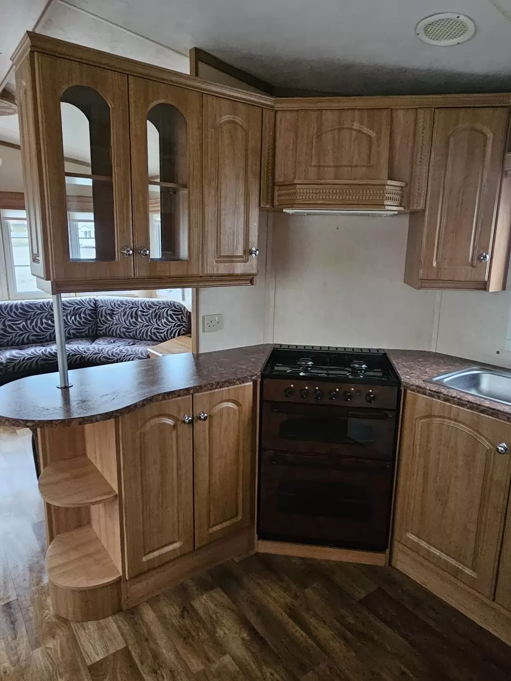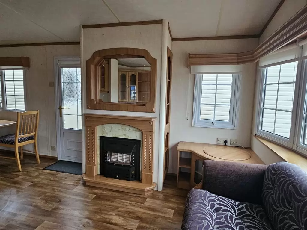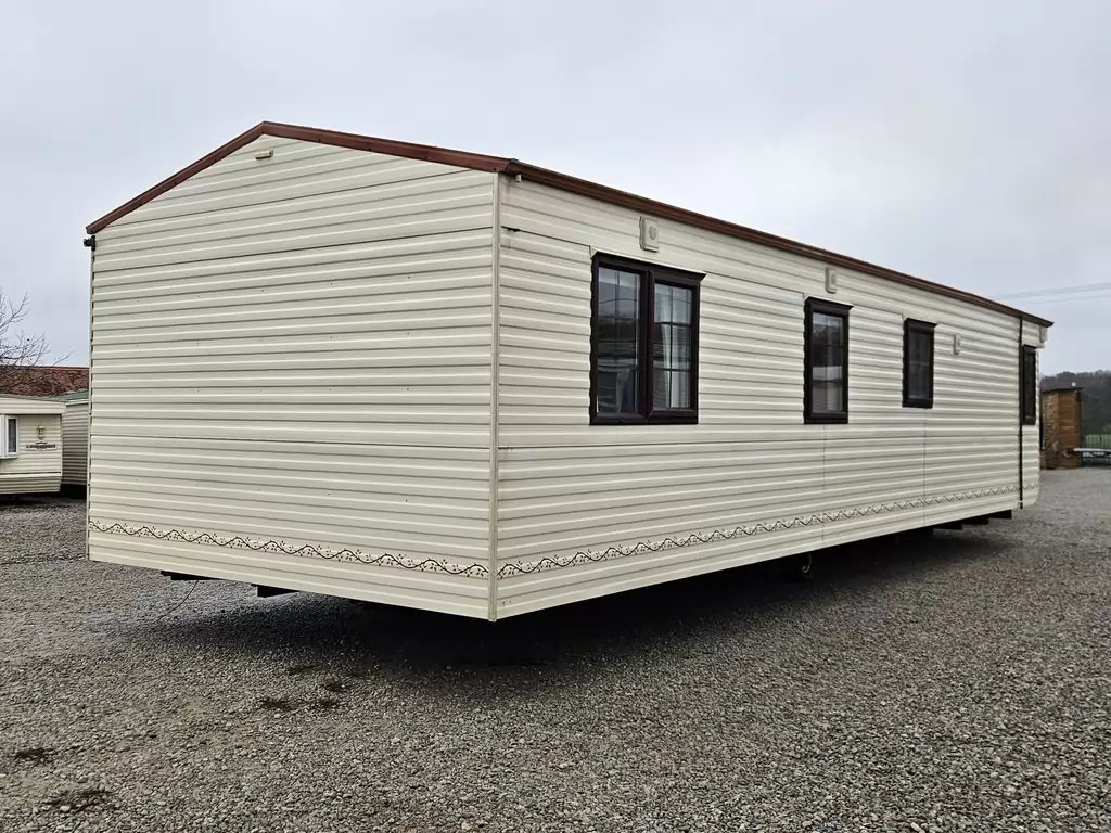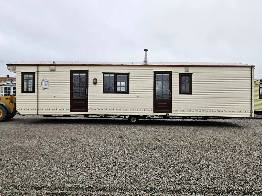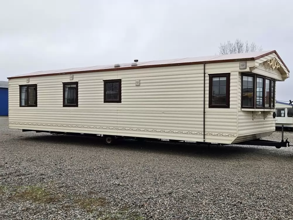 Extra breites, wunderschönes, sauberes und komplett ausgestattetes Mobilheim (11 x 3,7 m) mit zwei Eingängen, Satteldach, doppelten (isolierten) Fenstern und Türen (Dämmung). Wohnzimmer (Schlafsofa), Essbereich, U-förmige Küche inklusive Geräten, Schlafzimmer (Doppelbett) mit Ankleidezimmer, Schlafzimmer (2 Betten), Badezimmer mit Dusche und WC. Gaskamin und elektrische Heizung in den Räumen, Gaswarmwasserbereitung. Hohe Decken im gesamten Mobilheim!