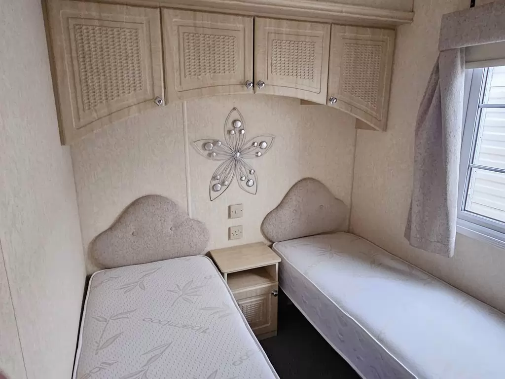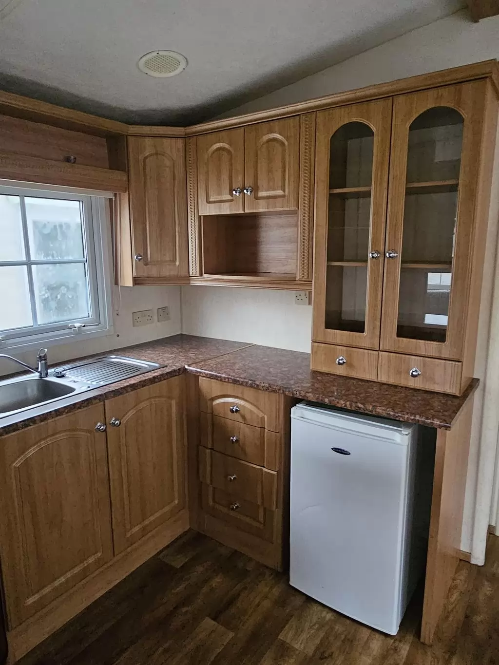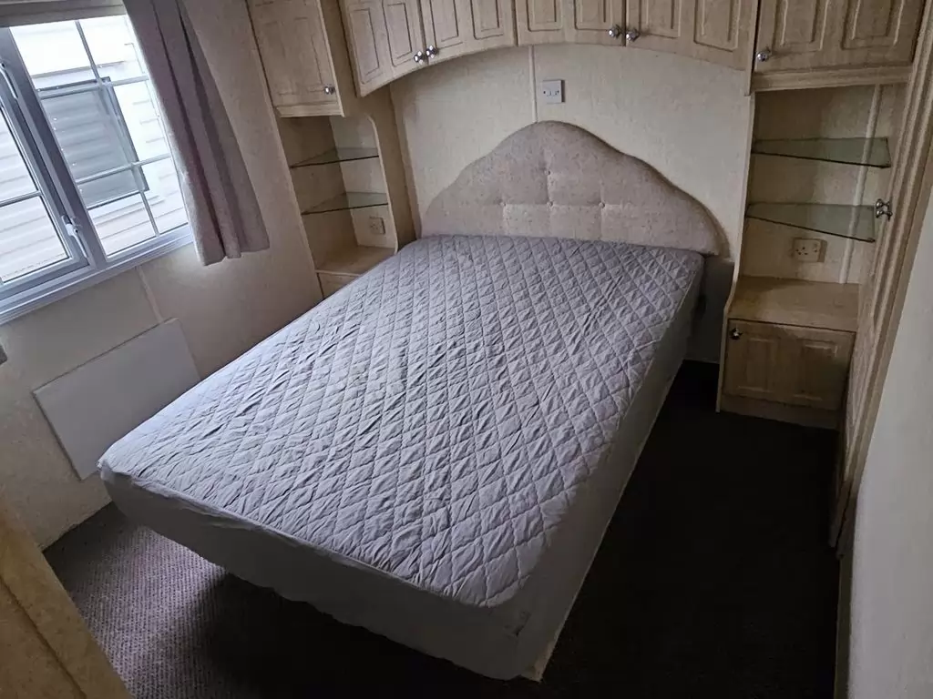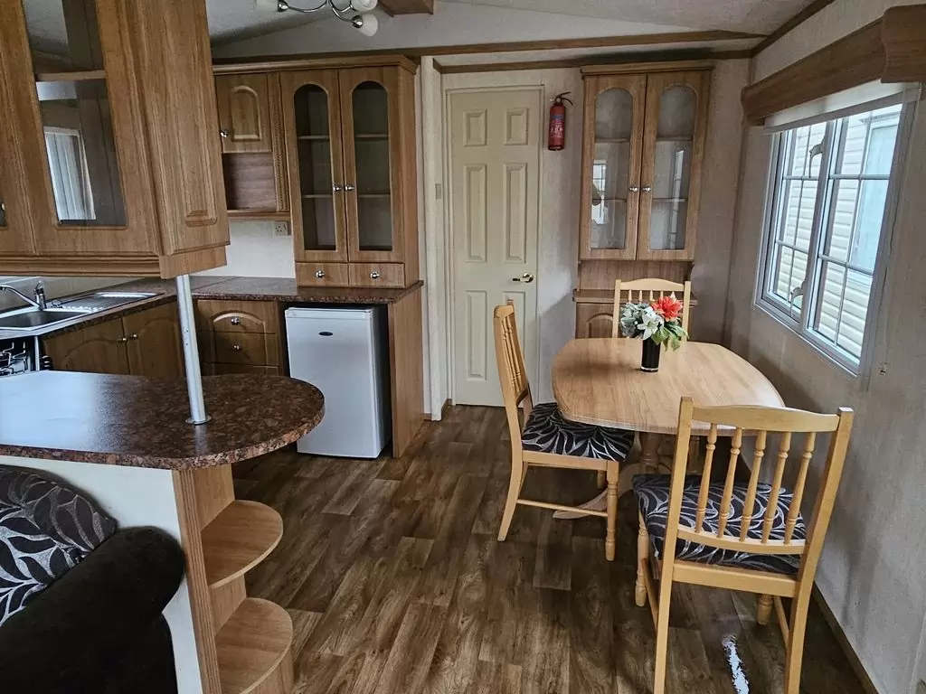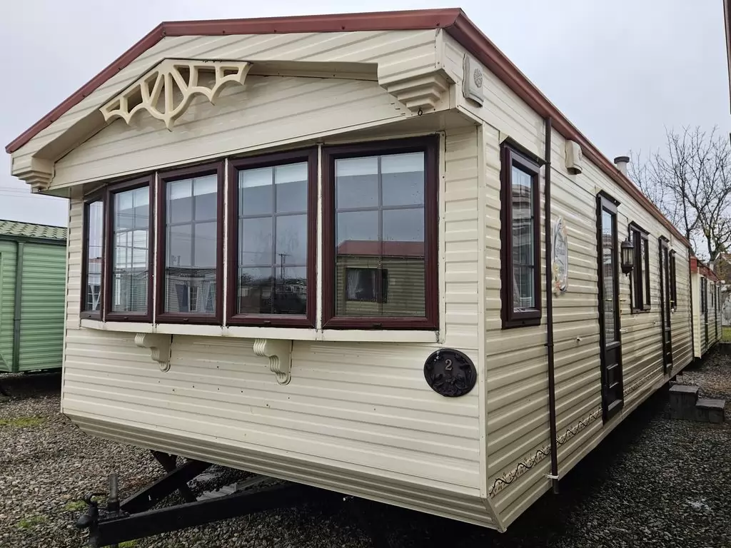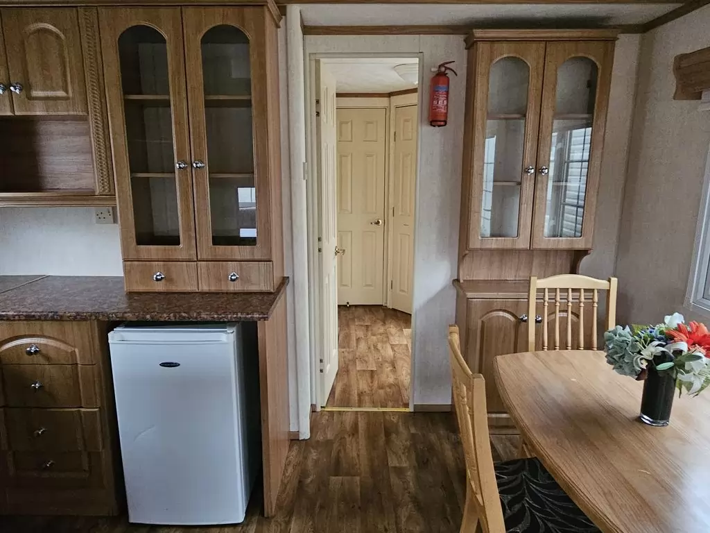 Extra breites, wunderschönes, sauberes und komplett ausgestattetes Mobilheim (11 x 3,7 m) mit zwei Eingängen, Satteldach, doppelten (isolierten) Fenstern und Türen (Dämmung). Wohnzimmer (Schlafsofa), Essbereich, U-förmige Küche inklusive Geräten, Schlafzimmer (Doppelbett) mit Ankleidezimmer, Schlafzimmer (2 Betten), Badezimmer mit Dusche und WC. Gaskamin und elektrische Heizung in den Räumen, Gaswarmwasserbereitung. Hohe Decken im gesamten Mobilheim!